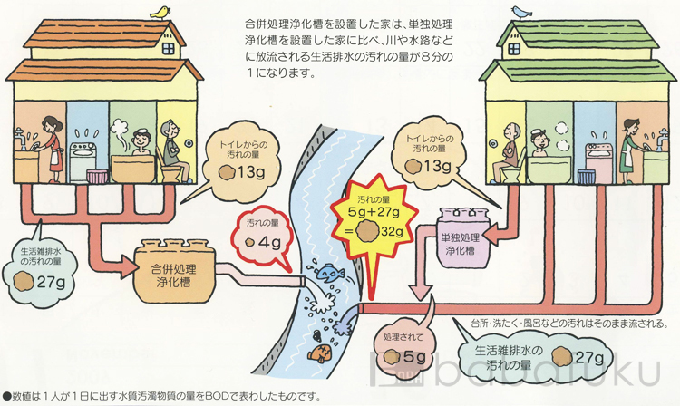 単独浄化槽はトイレからの汚水のみを処理するのに対し、